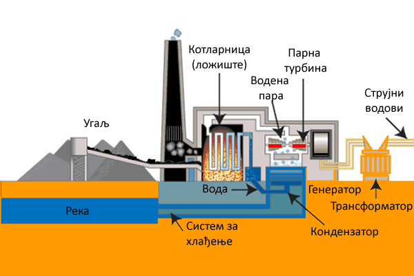 Termoelektrane su sve elektrane kod kojih se generatori pokreću toplotnim motorima, kao što su: parne turbine, dizel-motori, gasne turbine i slično. Najveću primenu imaju parne termoelektrane sa pogonom na ugalj . U parnim kotlovima ovih elektrana sagorevanjem uglja (toplotna energija), prvo se dobija vodena para pod pritiskom (potencijalnag energija), koja zatim pokreće parnu turbinu (mehanička energija), a ova električni generator koji proizvodi električnu energiju. Dakle, u procesu proizvodnje električne energije ostvaruje se sledeći niz transformacija jednog oblika energije u drugi: hemijska - toplotna - potencijalna - mehanička - električna. Termoelektrane se izgrađuju u blizini rudnika uglja, jer to pojevtinjuje proizvodnju električne energije. Na taj način se, naime, štedi u transportu, a može se koristiti i sitan ugalj. Termoelektrane koriste ugalj, naftu ili plin kao gorivo, ali im je izgradnja relativno jeftina i imaju druge prednosti u radu. One se naročito koriste u zimskim i letnjim mesecima kada nivo reka toliko opadne da hidroelektrane ne mogu da rade punim kapacitetom. Osim toga, neke veće toplane koriste se i kao elektrane. U stvari, u jednom elektroenergetskom sistemu rad termoelektrana i rad hidroelektrana se skladno dopunjuju.